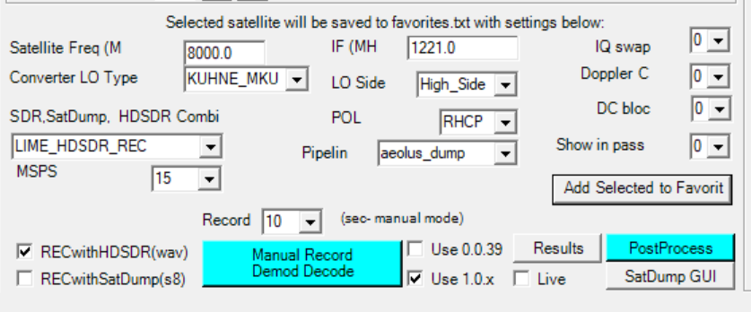 -One can manually launch HDSDR / SatDump with the proper settings per satellite (sampling rate, frequency etc). These can then be saved in the favorites.txt file.